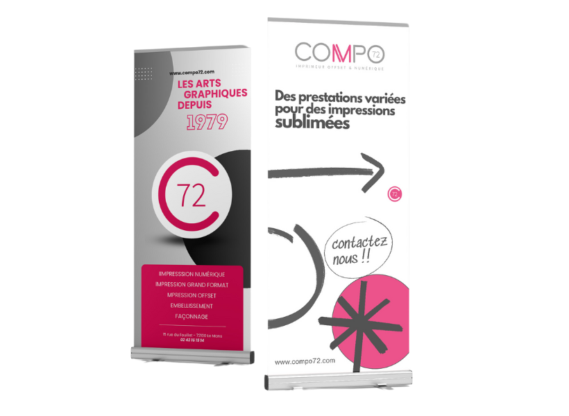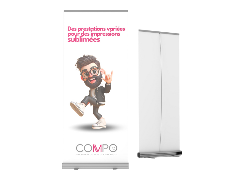 Un roll up standard (85x200 cm) est souvent suffisant. Assurez-vous que votre design reste lisible à distance et adapté aux dimensions choisies.
